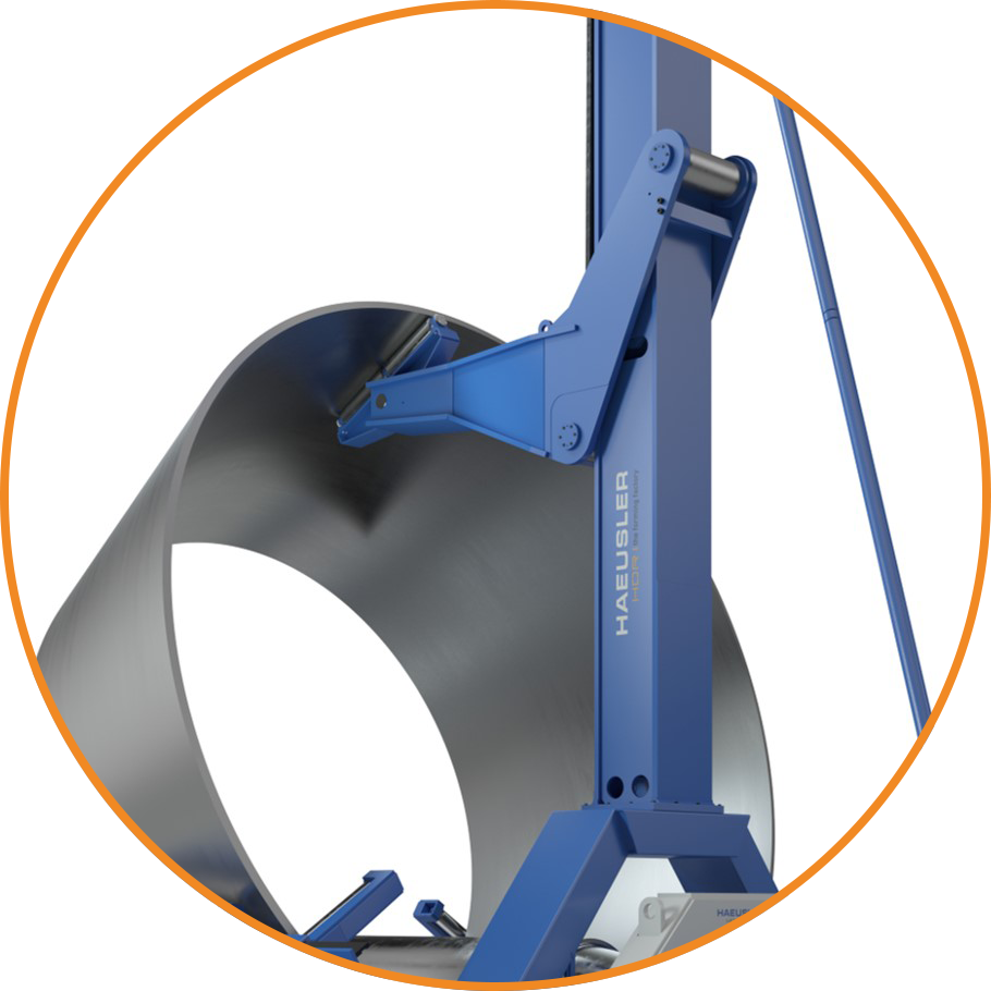 通过倾斜所有三个工作辊,可以将锥筒稳定地放置在设备上,对锥筒进行持续稳定的校圆。 锥筒也可以在没有调节机械手的情况下进行校圆。 调节机械手和上支撑装置确保了在设备上定位焊接锥筒的时间节省。